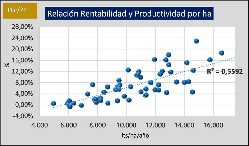 Por último, incorporamos el gráfico donde se obtiene la mayor correlación entre las variables económicas y productivas, en este caso la relación entre la Rentabilidad y la Productividad (medida en litros de leche por hectárea por año).
