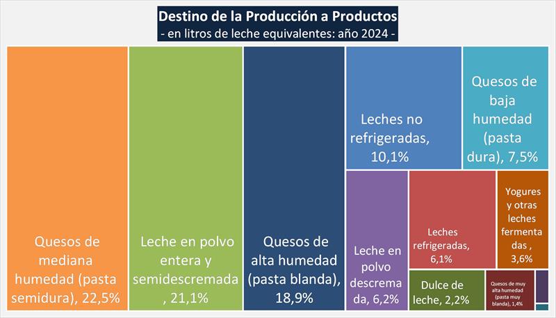 Por último, en el gráfico de abajo vemos la distribución porcentual a cada producto en litros de leche equivalentes para todo el año 2024, quesos 50%, leches en polvo 27%, leches fluidas 16% y resto de productos el 7%.