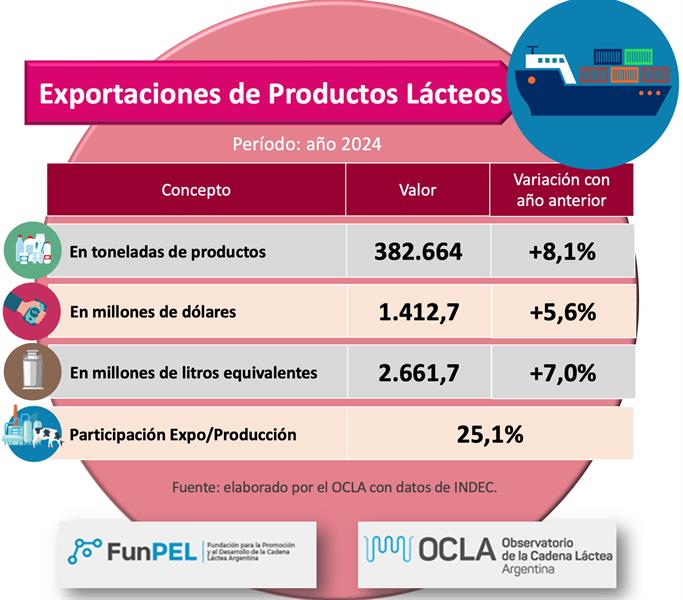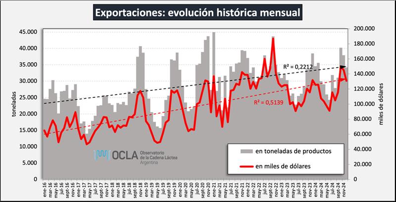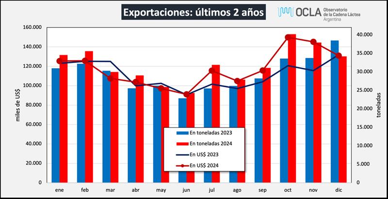 Las exportaciones de productos lácteos en diciembre de 2024 totalizaron 34.198 toneladas de productos, por un valor de US$ 130,9 millones, bajaron 9,9%, y 9,8% en volumen de productos, y en monto total en dólares, respectivamente, comparadas con el mes anterior.