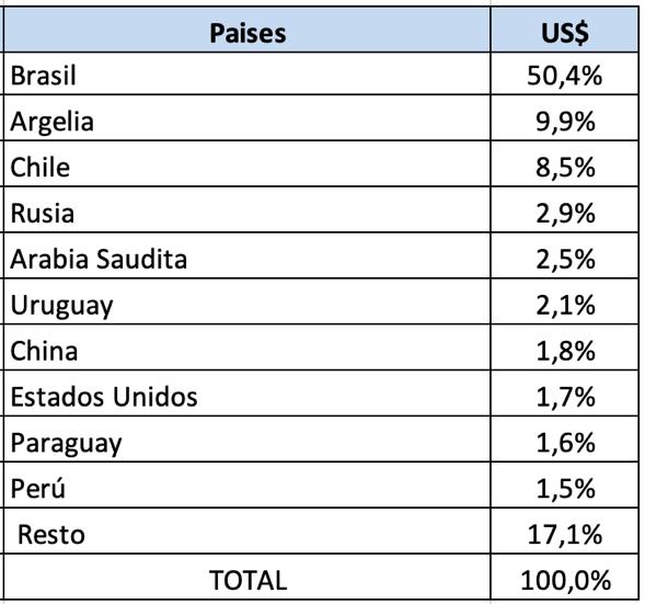 El destino de las exportaciones (en función al monto en dólares) se conformó: