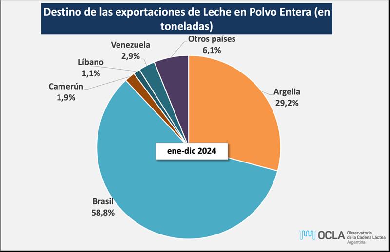En 2024 se da una participación de Brasil del 58,8% y de Argelia del 29,2% para Leche en Polvo Entera, siendo ambos los principales destinos habituales de exportación de nuestro productor más significativo en las exportaciones.