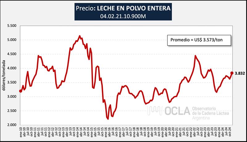 El precio medio de exportación por tonelada fue de US$ 3.692 para 2024, lo que implicó una caída del 2,3% respecto al año 2023. En el caso particular del rubro Leches en Polvo, el precio promedio fue de US$ 3.586/ton., un 1,5% por debajo del año anterior.