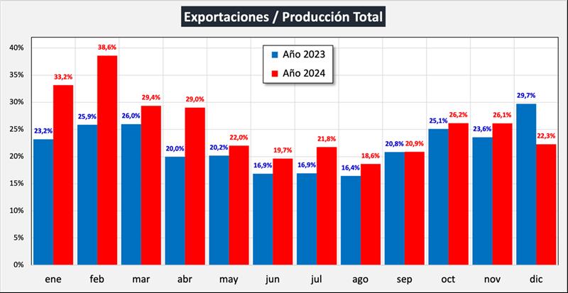 En el acumulado del período enero-diciembre de 2024, como puede verse en el flyer, aumentaron un 8,1% en volumen, subieron los ingresos en dólares un 5,6% y los litros equivalentes superaron al período enero-diciembre de 2023 en un 7,0%.