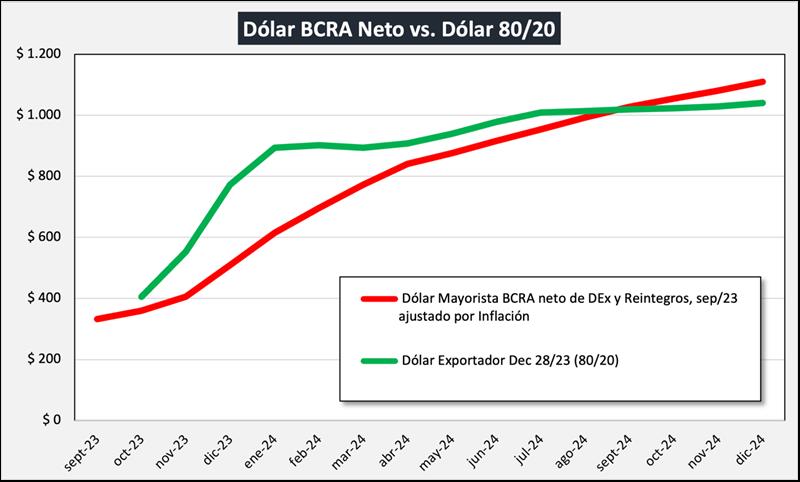 El gráfico final, muestra claramente que el valor del dólar neto de exportación de septiembre 2023 (mayorista BCRA – Derechos de Exportación + Reintegros), ajustado por inflación, es en octubre, superior al dólar especial del Decreto 28/23 (80% mayorista BCRA + 20% CCl), sin derechos de exportación, ni reintegros y luego de una importante devaluación en diciembre 2023.