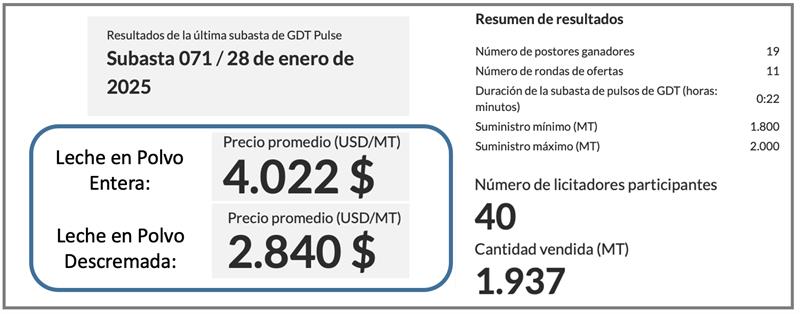 La subasta Nº 071 se ha llevado ha cabo en el día de hoy, martes 28 de enero, donde el precio promedio obtenido para la LPE ha sido de 4.022 /t, el cual representa una suba de 6,3% respecto a lo publicado en la última GDT pulse (3.782 US$/t) y representa un aumento de 0,9% respecto al último evento del GDT (3.988 US$/t).