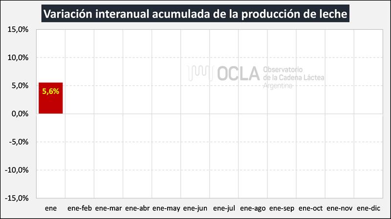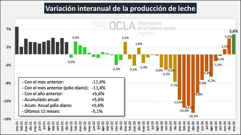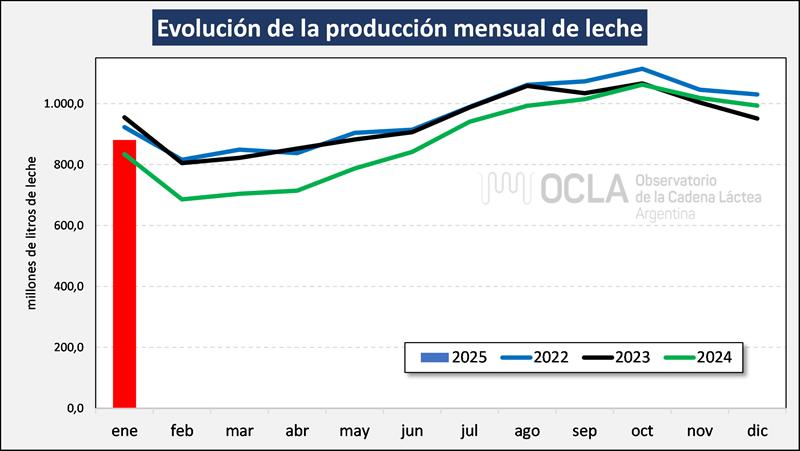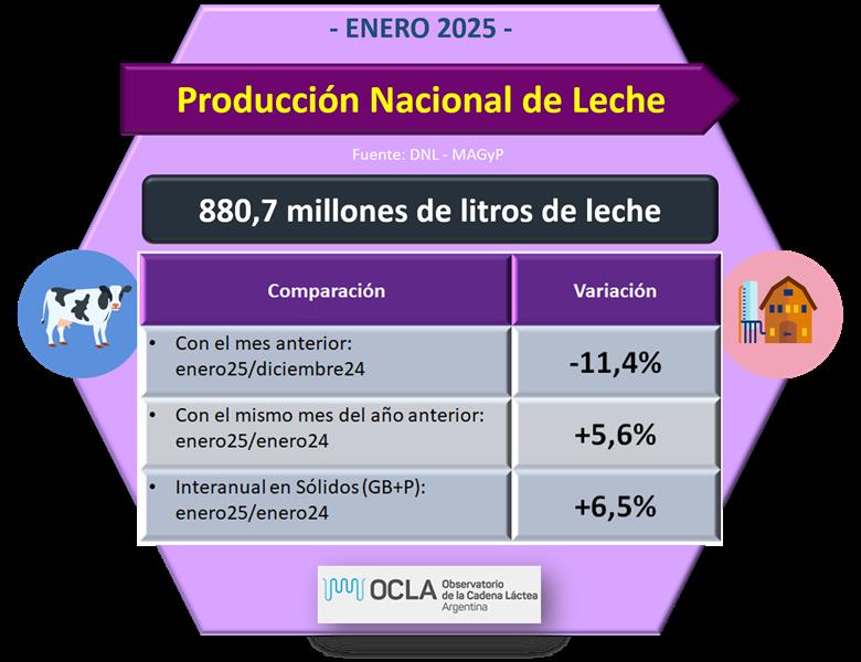 En el mes de enero del 2025 la producción fue de 880,7 millones de litros de leche, esto implica un valor 11,4% por debajo del mes anterior y un 5,6% más que igual mes del año anterior.