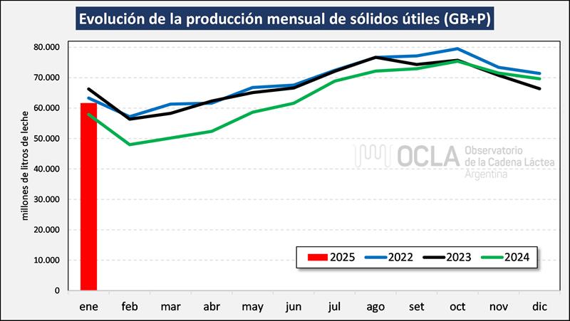 Abajo se puede ver la evolución de los denominados “sólidos útiles” (grasa butirosa y proteína), que subieron un 6,5% respecto a enero de 2024, superior a la suba de la producción en litros de leche (+5,6%), lo cual indica una mejora de los sólidos (Grasa Butirosa + Proteína), que pasaron del 6,94% en 2024 al 7,00% en 2025.