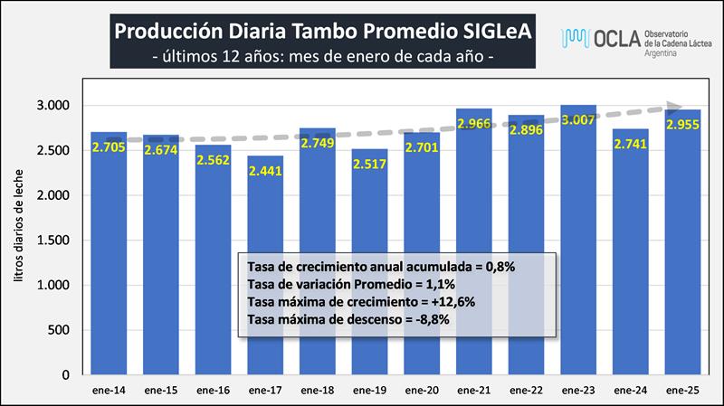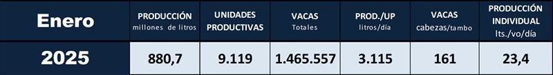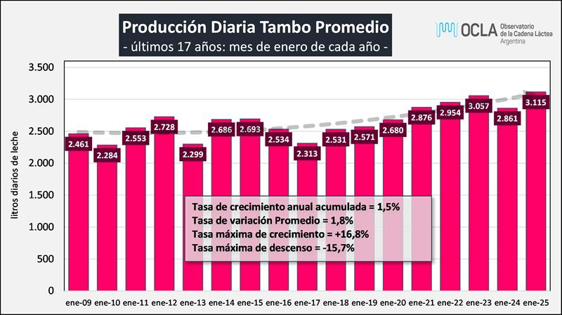 Sobre la base de la producción mensual y la cantidad de tambos que indica el Tablero Dinámico de SENASA, podemos inferir el tamaño del tambo promedio, unos 3.115 litros de leche diarios para enero de 2025, una producción superior al año anterior (+8,8%). Este valor surge por la combinación de 5,6% menos producción interanual en diciembre y por la menor cantidad de unidades productivas registradas en el tablero. En el período 2017-2025 el tambo promedio creció a una tasa del 3,8% anual, situación que se ve interrumpida en 2024 por diferentes factores.