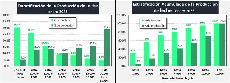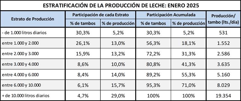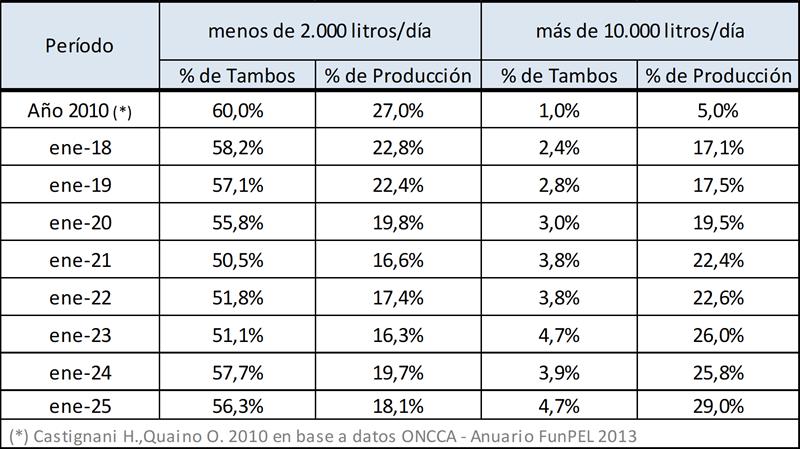 Entre 2010 y 2025 los tambos de menos de 2.000 litros de producción diaria venían reduciendo significativamente su importancia relativa en la producción de leche total y los tambos de más de 10.000 litros diarios de producción, multiplicaron por casi 6 su participación en la producción, a pesar del efecto de caída de la producción total que se dio en 2024.