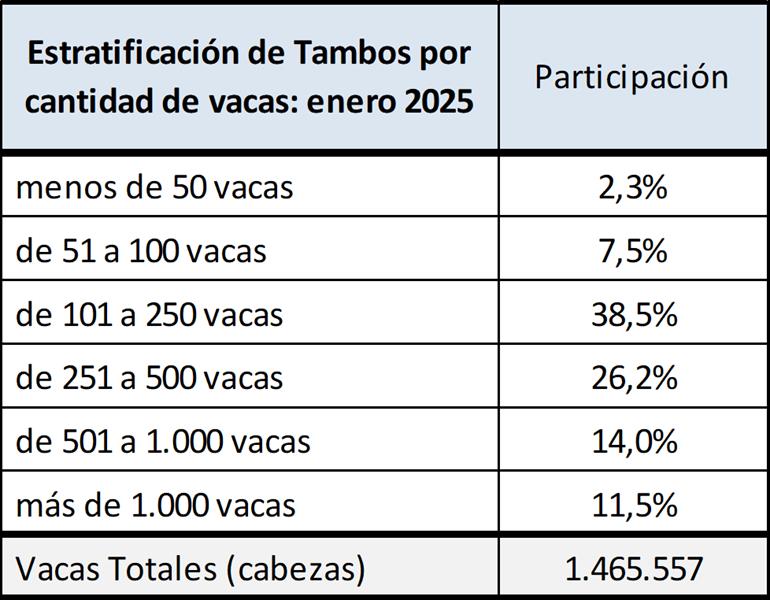 En el cuadro se presenta la participación de los tambos en función a su tamaño medido en litros de leche diarios del mes de enero de 2025 sobre la base SIGLeA - LUME:
