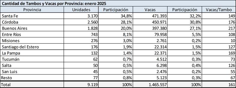 Con la información del monitoreo mensual podemos conocer la cantidad de unidades productivas y vacas en producción por provincia, como así también calcular la participación relativa de cada uno de esos ítems por provincia respecto al total nacional: