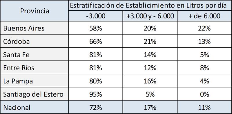 Puede verse en el cuadro siguiente al comparar con datos disponibles del año 2010, que en un extremo viene disminuyendo la participación tanto en cantidad de tambos como en el volumen de producción de las unidades productivas de menos de 2.000 litros diarios y en el otro extremo de la estratificación, se incrementa la participación de las unidades de más de 10.000 litros diarios, situación esta última, atemperada por la baja de producción en este último año.