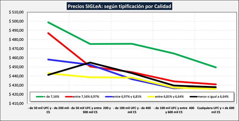 En el gráfico de arriba se presentan en 5 curvas por Tipo de leche en función a los sólidos útiles (grasa butirosa + proteína), los diferentes precios en función a la calidad higiénico-sanitaria (UFC/ml y RCS/ml). Se puede observar que existen precios descendentes en cada tipo composicional a medida que desmejora la calidad higiénico-sanitaria, pero se dan algunos serruchos ya que las “penalizaciones” por menor calidad se ven compensadas seguramente por la presencia de bonificaciones comerciales que pueden estar especificadas y tabuladas (ejemplo: volumen, temperatura, distancia, permanencia, etc.) o arbitrarias en función a aspectos no especificados en los Sistemas de Tipificación y Pago de la Leche (netamente comerciales).