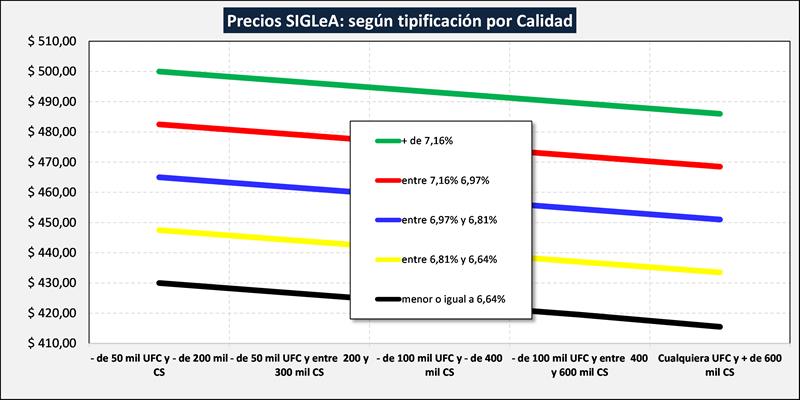 En el cuadro de tipificación, la leche comercializada se divide en 25 estratos según composición y calidad higiénico-sanitaria y, dentro de cada estrato, se muestra un promedio ponderado del precio del total de esos litros y además un promedio ponderado del 20% superior e inferior de los precios.