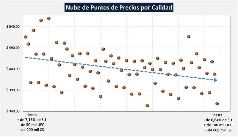 Si elaboramos una nube de puntos con los diferentes precios disponibles en función a las calidades, podemos observar que se da una pendiente descendente de precios a medida que es menor la calidad integral de la leche, pero esa pendiente podría ser mucho más pronunciada si se pretende incentivar la mejor calidad de leche.