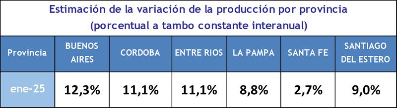 Se puede observar que la producción en las provincias tuvo grandes diferencias en su variación interanual en enero de 2025 comparada con enero de 2024. Cabe mencionar que el término “tambo constante” hace referencia a comparar todos los tambos de los que se tiene información de producción en la actualidad, con esos mismos tambos del año pasado, dejando de lado aquellos tambos que dejaron de remitir información, que comenzaron a remitir información este año, los que cesaron la actividad y los que iniciaron actividad este año.