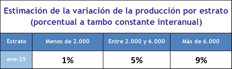 Si analizamos el comportamiento de la producción por estrato productivo, podemos observar que el estrato de más de 6.000 litros diarios de producción, tuvo un crecimiento interanual mucho mayor que el resto de los estratos (9%), en el enero de 2025. Por su parte los estratos, medio y bajo presentaron subas menores (5% y 1% respectivamente).