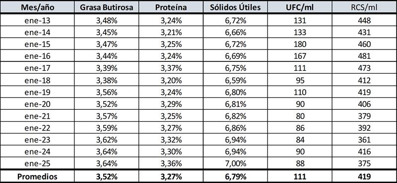 Evolución de la Calidad de Leche: mes de enero últimos 13 años