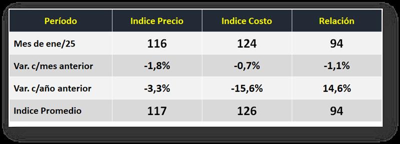 En enero de 2025 cae el índice precio algo más de lo que cae el índice costo lo que lleva la relación a un valor 94, -1,1% respecto al mes anterior, pero en el interanual (+14,6%) se refleja la mejora que ya indicamos en el informe de Costo, de los 12 últimos meses con rentabilidad positiva (3,9%).