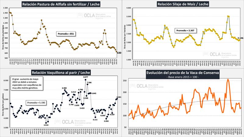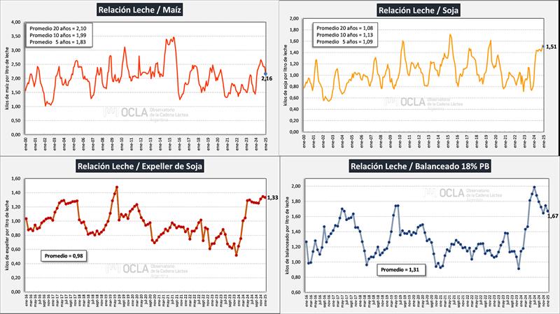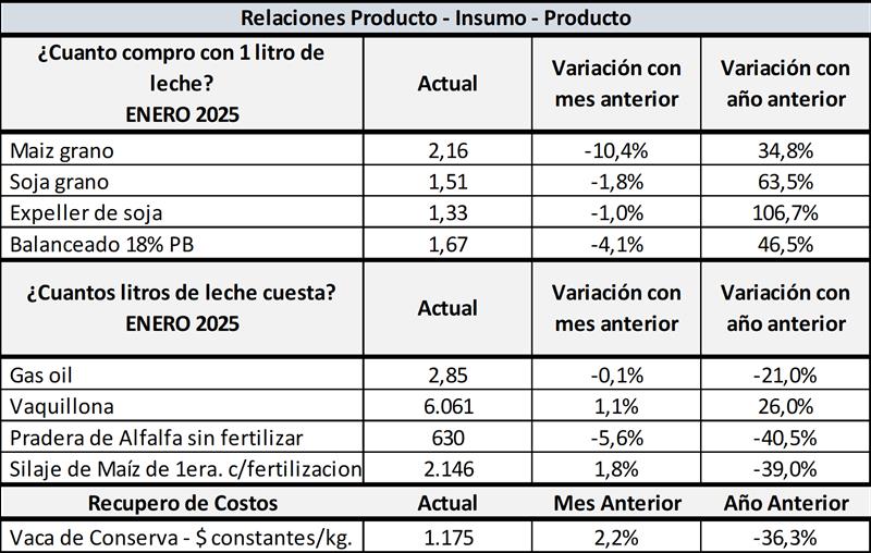 En su mayoría las relaciones de precios entre la leche y los principales insumos utilizados en la producción, se vienen deteriorando debido a que el ajuste de precios de la leche al productor, en los últimos meses está por debajo de los índices inflacionarios y además debido a la reducción de derechos de exportación en los granos. A pesar de ello los indicadores todavía son favorables, es decir, mejores que las medias históricas y las referencias habituales.