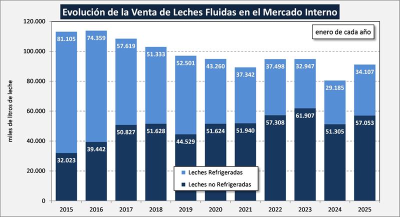 En los dos gráficos siguientes se presentan las ventas de leche fluida (en miles de litros), a enero de cada año (refrigeradas y no refrigeradas), donde se puede ver por un lado el descenso en el total de leches fluidas (al menos las que captura la Resolución 230) que se viene dando en los últimos años, pero en 2025 comienza con una reversión en esa tendencia. Por otra parte, en el gráfico que le sigue a éste, se evidencia claramente cómo fueron creciendo en participación las leches no refrigeradas en detrimento de las leches refrigeradas, pero en estos últimos años hubo cambio en ese proceso, volviendo a recuperar algo de terreno las leches refrigeradas.