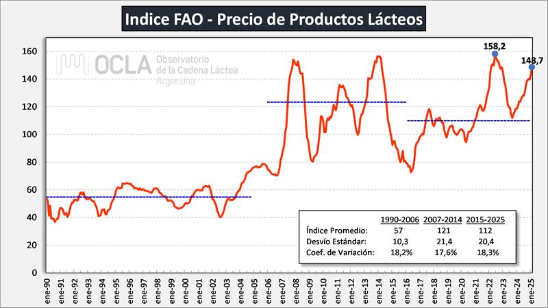 Por su parte el gráfico siguiente muestra el valor promedio de cada año del índice de precios de los lácteos de FAO de los últimos 26 años (2000-2025):