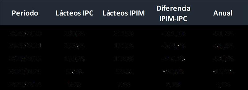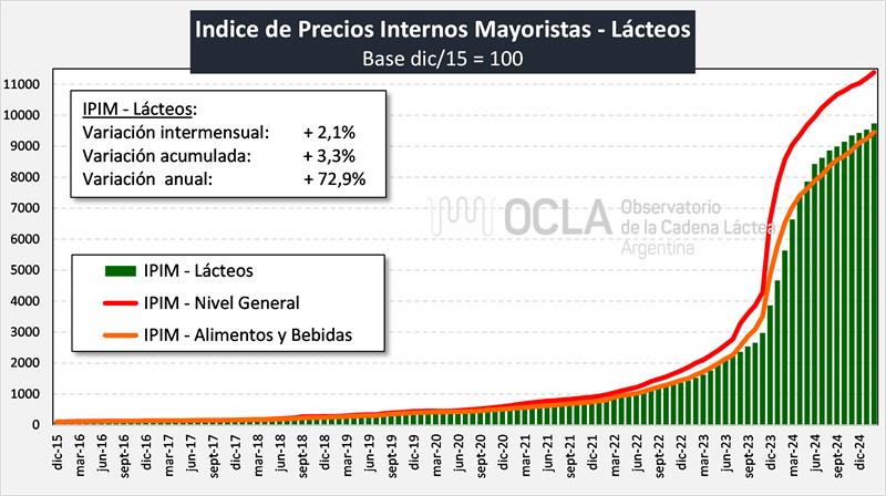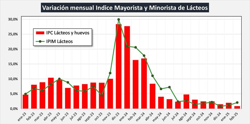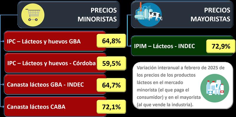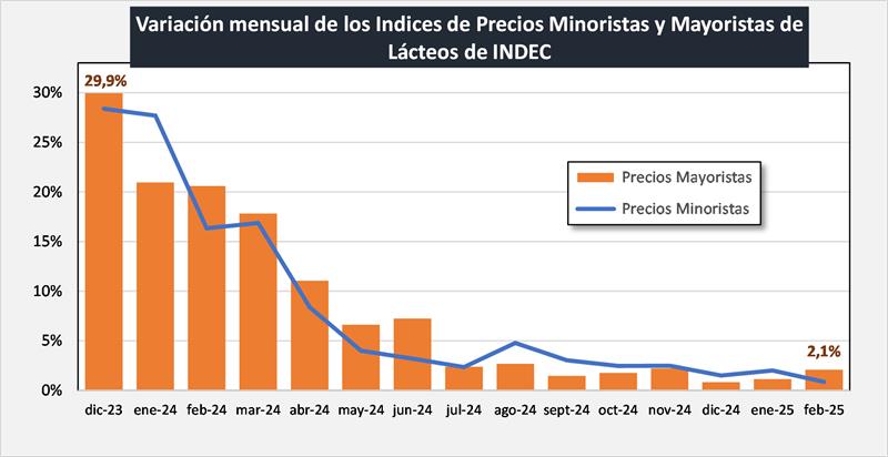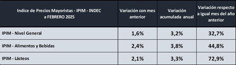 El índice mayorista de precios de los Lácteos registró un aumento de 2,1% en febrero de 2025 respecto del mes anterior, creció un 3,3% en el acumulado del año y se incrementó un 72,9% en el año, marcando en los lácteos un incremento interanual bastante superior al índice general y a la categoría de alimentos en los que se los incluye.
