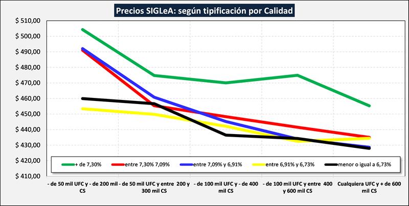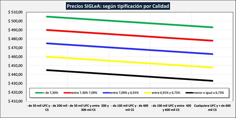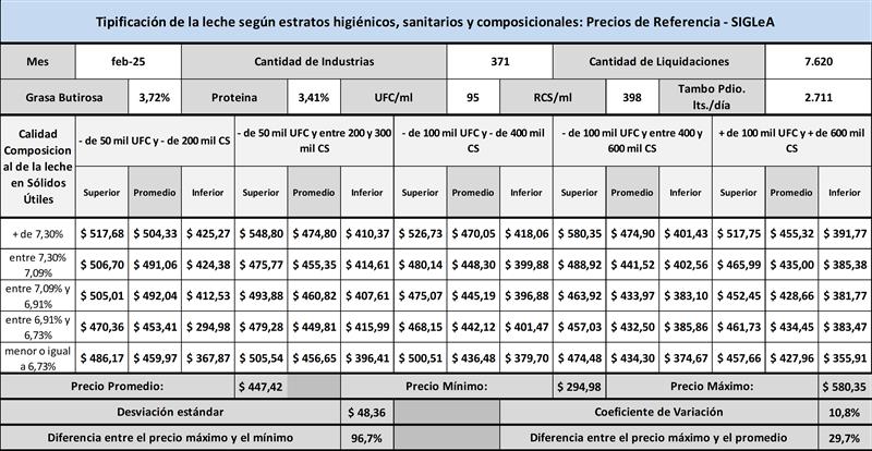 En el cuadro de tipificación, la leche comercializada se divide en 25 estratos según composición y calidad higiénico-sanitaria y, dentro de cada estrato, se muestra un promedio ponderado del precio del total de esos litros y además un promedio ponderado del 20% superior e inferior de los precios.
