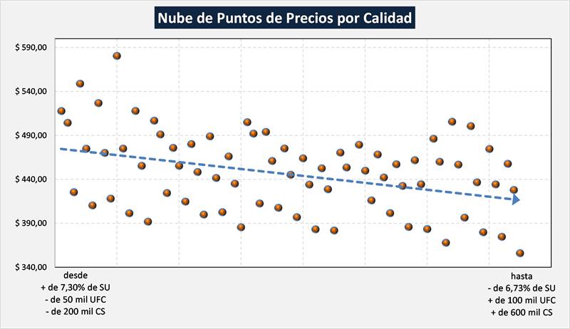 Si elaboramos una nube de puntos con los diferentes precios disponibles en función a las calidades, podemos observar que se da una pendiente descendente de precios a medida que es menor la calidad integral de la leche, pero esa pendiente podría ser mucho más pronunciada si se pretende incentivar la mejor calidad de leche.