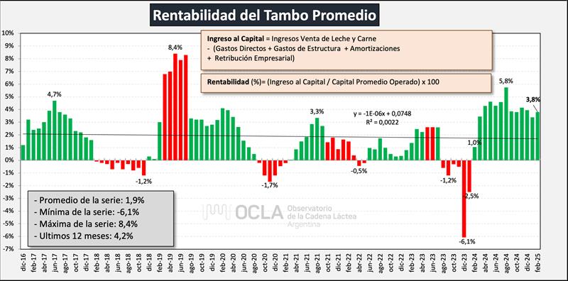 Como lo veníamos informando en oportunidades anteriores se había producido un fuerte desacople en diciembre 2023 (por la devaluación y la alta inflación), entre precios y costos y señalábamos que los precios de la leche venían creciendo por encima de la inflación y que pronto se produciría la convergencia, es por ello que ya en febrero se puede observar una tasa de rentabilidad positiva que se acentúa entre marzo y mayo, que en junio pasado cae levemente por un menor incremento del precio que el de los costos y retoma un valor igual a mayo en julio y en agosto alcanza el 5,8% que luego cae en septiembre, octubre a valores algo por encima del 3% de rentabilidad, llega a 4,1% en noviembre y se reduce levemente en diciembre (3,9%) y a 3,8% en febrero próximo pasado.
