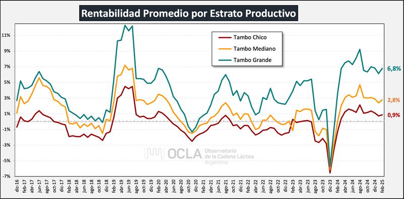 Si desagregamos la rentabilidad promedio y la graficamos para los estratos grande, mediano y chico vemos que la evolución de la rentabilidad de los tambos grandes siempre está por arriba (incluso por momentos, considerablemente) de los tambos medianos y chicos.