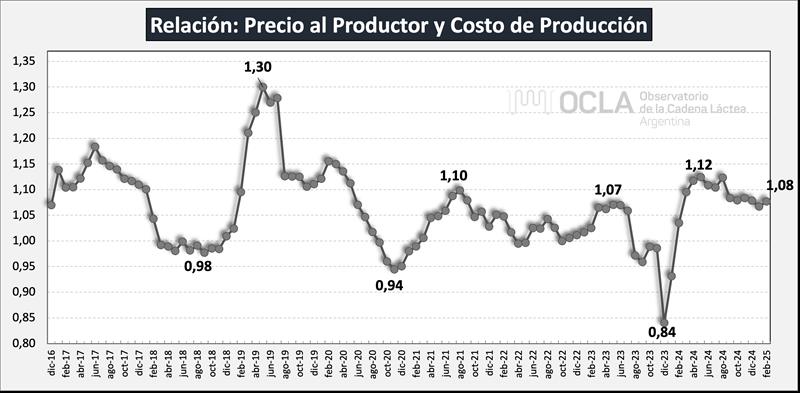 El gráfico siguiente muestra la relación entre el precio percibido y el costo de producción, que cuando el factor supera 1 el precio es superior al costo. Esta relación que llegó a 1,12 en mayo pasado, cae a 1,09 en noviembre, pero sostiene valores por encima de 1 para 11 de los 12 meses de 2024. Arranca la relación en 2025 con un índice de 1,07 a pesar de la baja en moneda constante del precio al productor y se mantiene en 1,08 en febrero 2025.