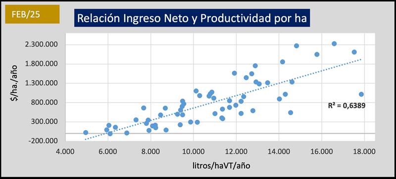 Por último, incorporamos el gráfico donde se obtiene la mayor correlación entre las variables económicas y productivas, en este caso la relación entre el Ingreso Neto y la Productividad (medida en litros de leche por hectárea por año).