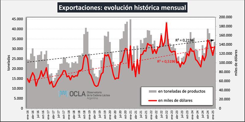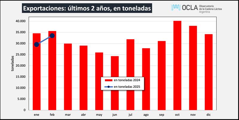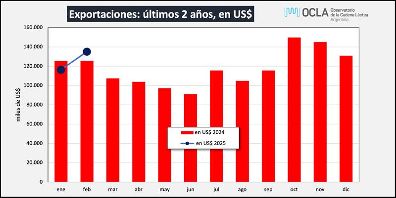 Las exportaciones de productos lácteos en febrero de 2025 totalizaron 33.568 toneladas de productos, por un valor de US$ 135,2 millones, subieron 13,5%, y 16,2% en volumen de productos, y en monto total en dólares, respectivamente, comparadas con el mes anterior.
