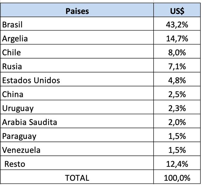 El destino de las exportaciones (en función al monto en dólares) se conformó: