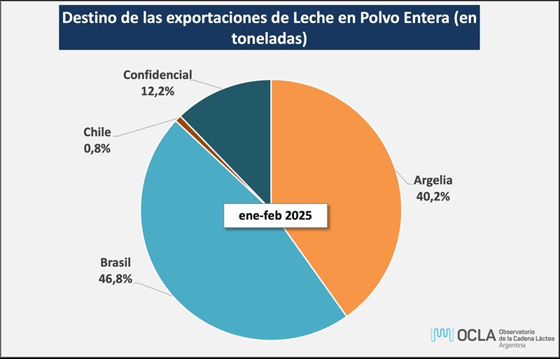 En el primer bimestre se dio una participación de Brasil del 46,8% y de Argelia del 40,2% para Leche en Polvo Entera, siendo ambos los principales destinos habituales de exportación de nuestro productor más significativo en las exportaciones.