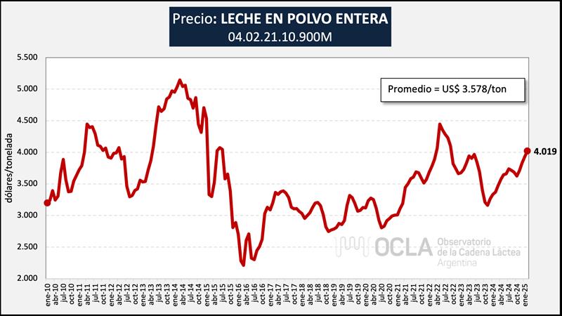 El precio medio de exportación por tonelada fue de US$ 3.983 para el primer bimestre de 2025, lo que implicó una suba del 11,3% respecto al año 2024. En el caso particular del rubro Leches en Polvo, el precio promedio fue de US$ 3.890/ton., un 15,5% por encima del año anterior.
