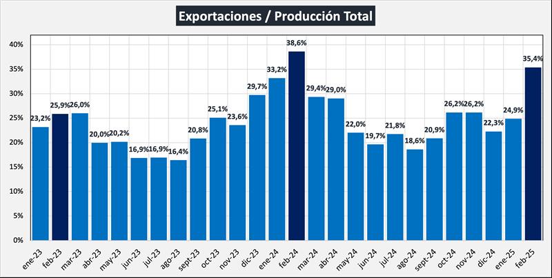 En litros de leche equivalentes (enero-febrero 2025), las exportaciones cayeron el 11,0% y representaron el 29,7% de la producción total (en el período enero-febrero de 2024 representaron el 32,4%).
