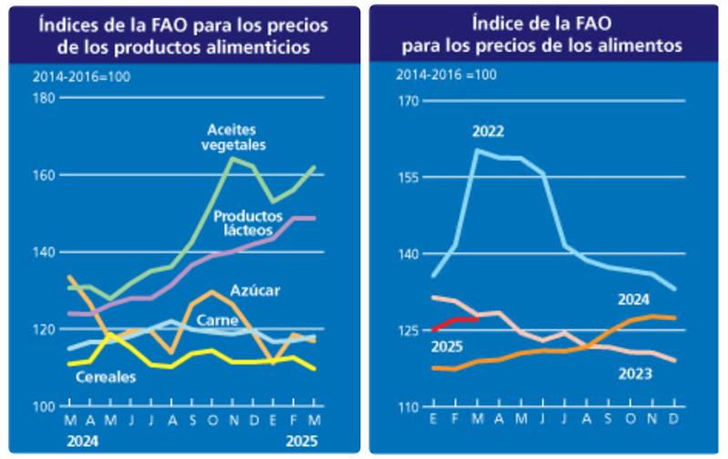 El índice de precios de los productos lácteos de la FAO se situó en marzo en un promedio de 148,7 puntos, esto es, sin variaciones desde febrero de 2025, pero aun así 24,6 puntos (un 19,9 %) por encima de su valor de hace un año. La estabilidad del índice obedece a un descenso de los precios internacionales del queso que se vio compensado por el aumento de las cotizaciones de la mantequilla y la leche en polvo. Los precios internacionales de la mantequilla aumentaron por tercer mes consecutivo, un 3,9 % más que en febrero, impulsados por las grandes ventas al por menor y la creciente demanda internacional en un contexto de disminución estacional de la oferta en Oceanía y escasa producción en Europa. Los precios de la leche desnatada en polvo aumentaron por segundo mes consecutivo, sustentados al combinarse la fuerte demanda internacional con la mayor escasez de suministros. Las cotizaciones internacionales de la leche entera en polvo también subieron ligeramente, ya que la variada demanda de exportaciones en Europa —al verse afectada por la presencia de la enfermedad de fiebre aftosa en algunos países europeos— se vio equilibrada en gran medida por la menor actividad de compra a escala mundial desde Oceanía en un contexto de disminución estacional de la producción lechera. Los precios internacionales del queso disminuyeron un 1,8 % tras nueve meses de aumentos consecutivos, impulsados por la estabilidad de la oferta en Europa junto al debilitamiento de la demanda internacional y nacional en Oceanía.