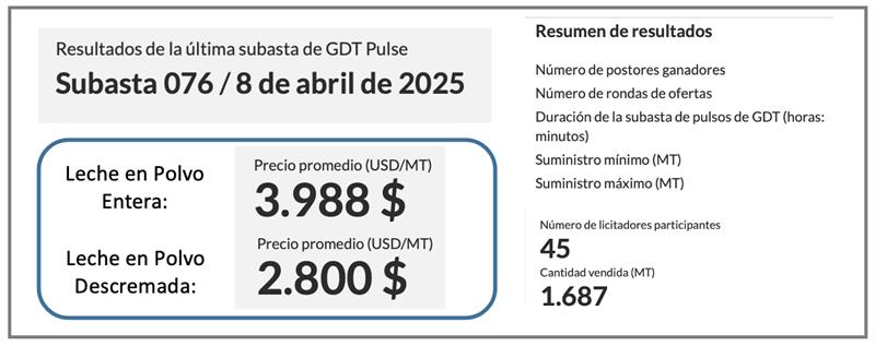 La subasta Nº 076 se ha llevado ha cabo en el día de hoy, martes 8 de abril, donde el precio promedio obtenido para la LPE ha sido de 3.988 US$/t, el cual representa una leve suba de 0,6% respecto a lo publicado en la última GDT pulse (3.964 US$/t) y representa una disminución de 1,8% respecto al último evento del GDT (4.062 US$/t).