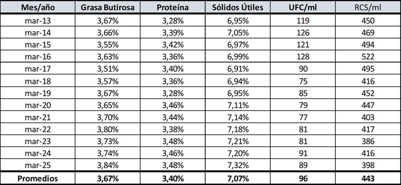 Evolución de la Calidad de Leche: mes de marzo últimos 13 años