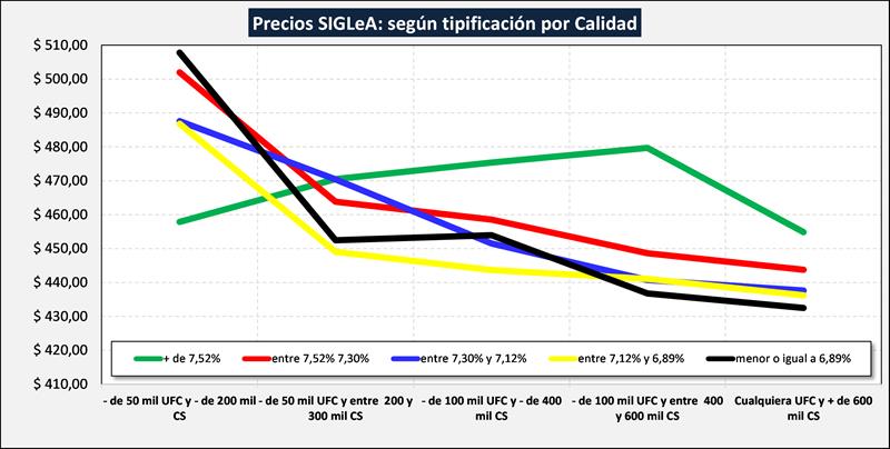 En el gráfico de arriba se presentan en 5 curvas por Tipo de leche en función a los sólidos útiles (grasa butirosa + proteína), los diferentes precios en función a la calidad higiénico-sanitaria (UFC/ml y RCS/ml). Se puede observar que existen precios descendentes en cada tipo composicional a medida que desmejora la calidad higiénico-sanitaria, pero se dan algunos serruchos ya que las “penalizaciones” por menor calidad se ven compensadas seguramente por la presencia de bonificaciones comerciales que pueden estar especificadas y tabuladas (ejemplo: volumen, temperatura, distancia, permanencia, etc.) o arbitrarias en función a aspectos no especificados en los Sistemas de Tipificación y Pago de la Leche (netamente comerciales).