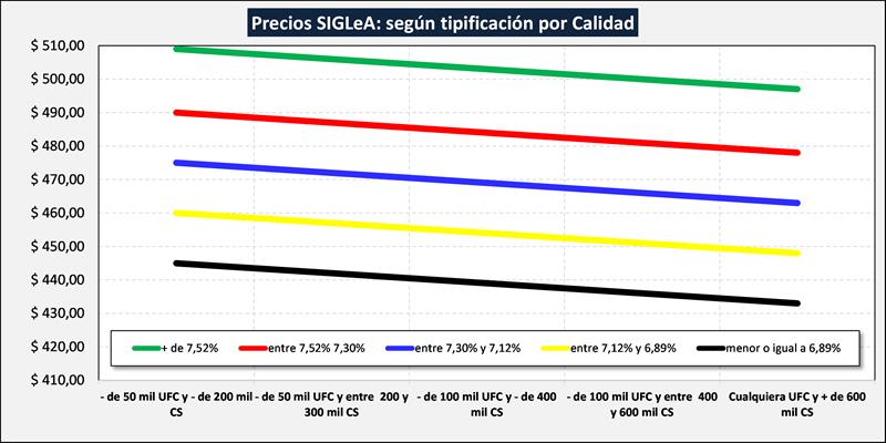 En el cuadro de tipificación, la leche comercializada se divide en 25 estratos según composición y calidad higiénico-sanitaria y, dentro de cada estrato, se muestra un promedio ponderado del precio del total de esos litros y además un promedio ponderado del 20% superior e inferior de los precios.
