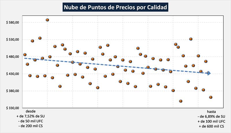 Si elaboramos una nube de puntos con los diferentes precios disponibles en función a las calidades, podemos observar que se da una pendiente descendente de precios a medida que es menor la calidad integral de la leche, pero esa pendiente podría ser mucho más pronunciada si se pretende incentivar la mejor calidad de leche.