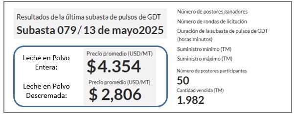 La subasta Nº 079 se ha llevado ha cabo en el día de ayer, martes 13 de mayo, donde el precio promedio obtenido para la LPE ha sido de 4.354 US$/t, el cual representa una suba de 3,0% respecto a lo publicado en la última GDT pulse (4.225 US$/t) y una baja de 0,5% respecto al último evento del GDT (4.374 US$/t).