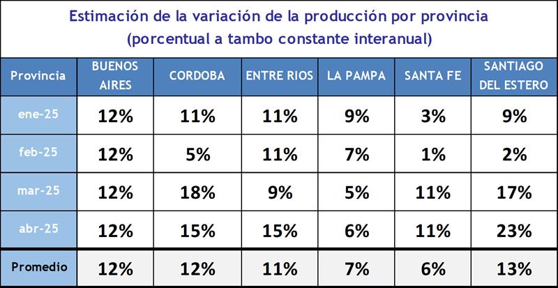 Se puede observar que la producción en las provincias tuvo grandes diferencias en su variación interanual en el primer cuatrimestre de 2025 comparada con igual período de 2024. Cabe mencionar que el término “tambo constante” hace referencia a comparar todos los tambos de los que se tiene información de producción en la actualidad, con esos mismos tambos del año pasado, dejando de lado aquellos tambos que dejaron de remitir información, que comenzaron a remitir información este año, los que cesaron la actividad y los que iniciaron actividad este año.