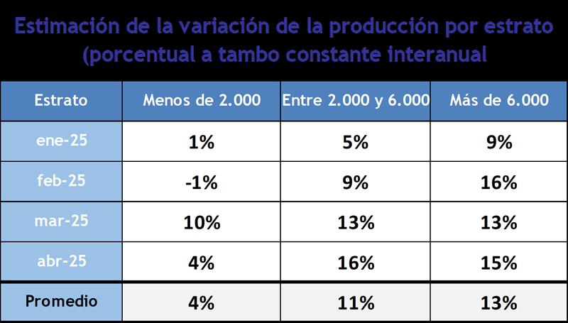 Si analizamos el comportamiento de la producción por estrato productivo, podemos observar que el estrato de más de 6.000 litros diarios de producción, tuvo un crecimiento interanual mucho mayor que el resto de los estratos (13%), en el primer cuatrimestre de 2025. Por su parte los estratos, medio y bajo presentaron subas menores (11% y 4% respectivamente).