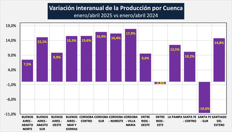 Por último, el análisis de los primeros cuatro meses del año 2025 se realiza sobre las diferentes regiones productivas en función a la producción promedio por tambo (no tambo constante), donde también se observa una gran variabilidad atribuible a distintos factores.