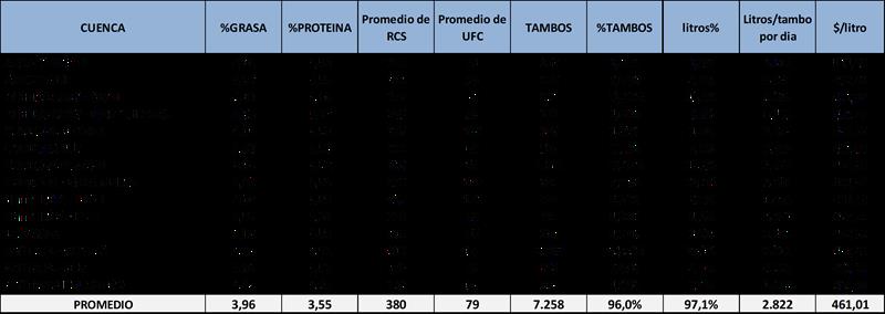 En el cuadro puede observarse que las columnas de participación en cantidad de tambos y producción, los totales no llegan al 100% ya que faltan los tambos fuera de cuencas tradicionales.