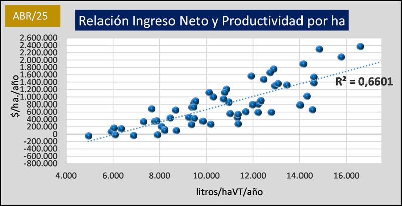 Por último, incorporamos el gráfico donde se obtiene la mayor correlación entre las variables económicas y productivas, en este caso la relación entre el Ingreso Neto y la Productividad (medida en litros de leche por hectárea por año).